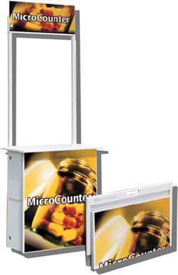 Micro Counter Medidas/armado Frente: 74 cm Altura a la mesa: 80 cm Fondo: 40 cm Altura total: 198 cm Medidas del área gráfica Copete: 60 cm de ancho x 24 cm de alto Cuerpo: 66 cm de ancho x 74 cm de alto Fabricado en ABS Pesa solamente 6 kilos y soporta hasta 40 kilos en su mesa de trabajo. Incluye maleta de lona << Regresar