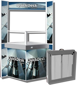 Quick Desk Medidas armado Frente: 85 cm Altura: 180 cm Fondo: 85 cm Medidas del área grafica 1 Copete 89.5 cm x 18 cm 2 Laterales Inferiores 18 cm x 98 cm 2 Laterales Superiores 18 cm x 80 cm 2 Bases 66 cm x 68 cm Pesa 16 kg Incluye maleta de lona con ruedas << Regresar